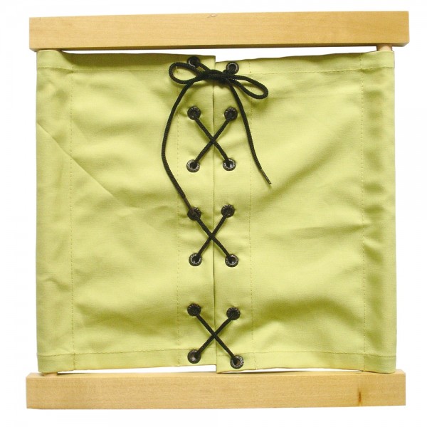 Čtvercový rám o délce 30 cm má na dvou stranách navlečeny dva díly látky spojené šněrováním.
