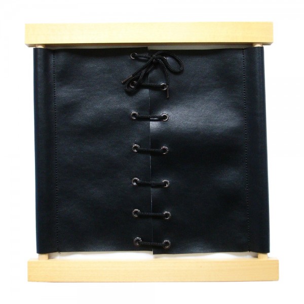 Čtvercový rám o délce 30 cm má ze dvou stran navlečeny dva díly kožené látky spojené šněrováním tkaničkami.